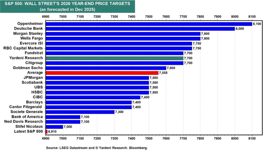 Wall Street forecasts for year-end 2026 S&P 500 levels cluster around 7,500-8,000, with optimistic calls reaching ~8,200 from firms like Oppenheimer and Deutsche Bank, reflecting expectations for mid-teens growth. Current levels hover near 6,800, implying significant potential upside. Notably, nearly all strategists anticipate gains, with only one projecting a down year, reinforcing our view that quality, diversified exposure positions portfolios for long-term success amid varying outcomes.